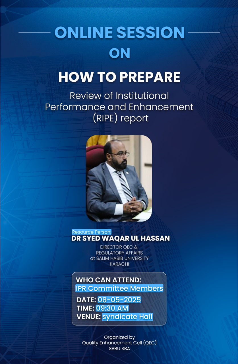 Shaheed Benazir Bhutto University, Shaheed Benazirabad has proudly completed its annual Self Review of Institutional Performance and Enhancement (RIPE) for the academic year 2024–2025, in alignment with HEC’s PSG-2023 framework.