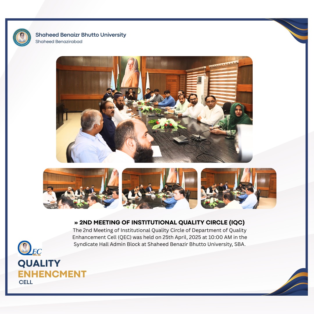 The 2nd Meeting of Institutional Quality Circle of Department of Quality Enhancement Cell (QEC) was held on 25th April, 2025 at 11:40 AM in the Syndicate Hall Admin Block at Shaheed Benazir Bhutto University, SBA. (View details)