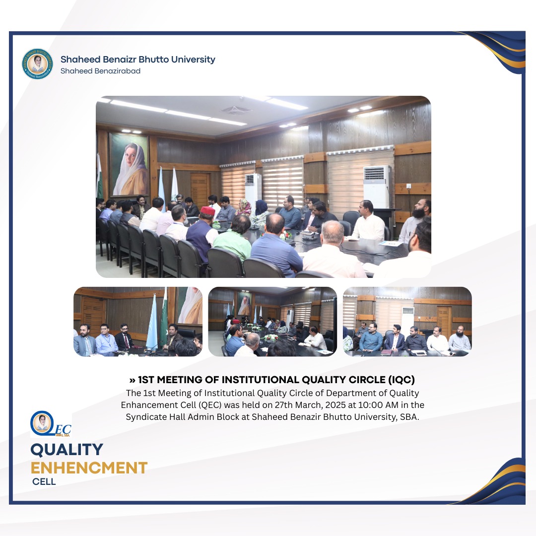 The 1st Meeting of Institutional Quality Circle of Department of Quality Enhancement Cell (QEC) was held on 27th March, 2025 at 10:00 AM in the Syndicate Hall Admin Block at Shaheed Benazir Bhutto University, SBA. (View details)