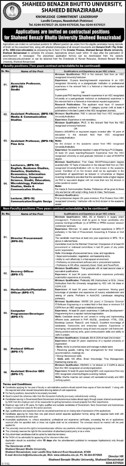 16-08-2024Associate Professor (BPS-20) (Sindhi), Assistant Professor (BPS-19) (Media and Communication Studies), Assistant Professor (BPS-19) (Fine Arts), Lecturer (BPS-18) (English, Business Studies, Genetics, Statistics, Economics, Information Technology, Computer Science, Sindhi, Education, Microbiology, Pakistan Studies, Media & Communication Studies), Lecturer (BPS-18) (Communication/Graphic Design), Director Procurement (BPS-20), Secrecy Officer (BPS-17), Horticulturist/Plantation Officer (BPS-17), Computer Programmer/Developer (BPS-17), Protocol Officer (BPS-17), Assistant Director QEC (BPS-17).