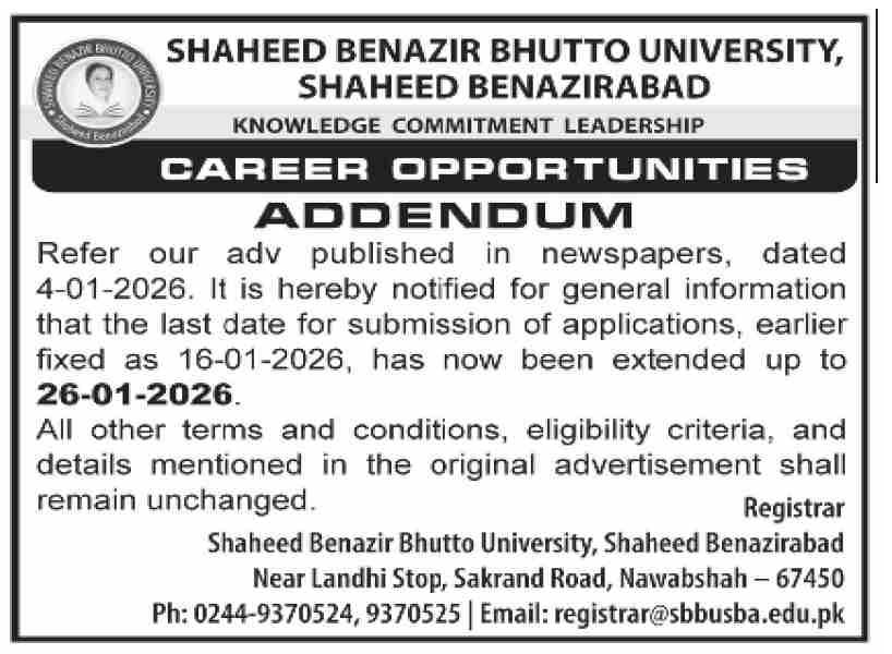 Applications along with updated CV to be sent to hrms@sbbusba.edu.pk and director.hr@sbbusba.edu.pk by 05 December 2023.