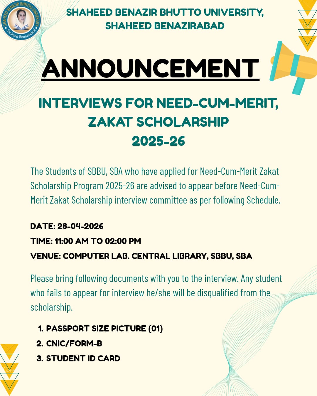 Shaheed Benazir Bhutto University announces that interviews for the Need-Cum-Merit Zakat Scholarship 2025–26 will be held on 28 April 2026 (11:00 AM – 02:00 PM) at the Computer Lab, Central Library. Applicants are advised to appear as per schedule with required documents. » View Details » List of Students 21-04-2026